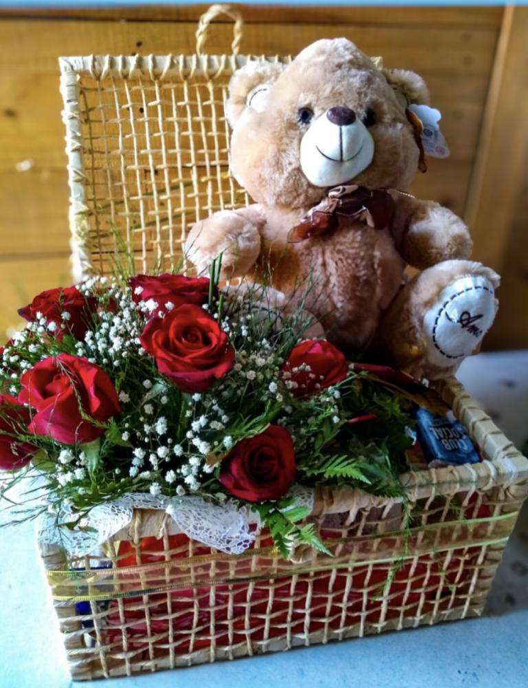 Cesta de Café da Manhã no Baú com Buquê e Ursinho R$ 389,00